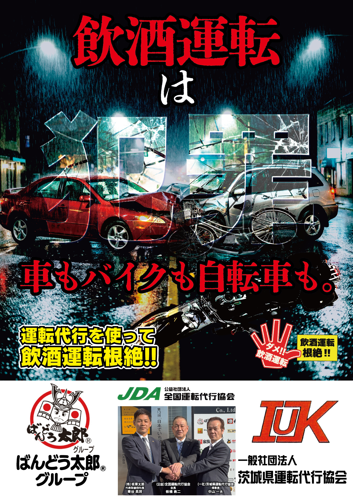 このたび、ばんどう太郎グループは、当協会および茨城県運転代行協会の「飲酒運転根絶」活動に賛同し、ポスターの作成に至っています。